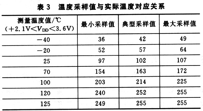 当采样温度值小于-40℃对应的值时,按0.8℃/位的变化率进行计算。温度采样值小于25℃对应的采样值时,以上限为基准进行计算,因为其上限出现的机率更大,这样得出的结果误差会小些;当采样温度值大于25℃对应的采样值时,以下限为基准进行计算,因为下限出现的机率更大。比如,采样值介于25℃对应的采样值和70℃对应的采样值之间,则以25℃为基准。