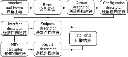 USB的数据传输共有四种类型:(1)控制传输;(2)中断传输;(3)批量传输;(4)同步传输。在USB键盘中只用到控制传输和中断传输。所有的USB设备,必须通过系统列举才可以正常使用。USB协议规定几种必需的描述符:设备描述符,配置描述符,接口描述符,端点描述符,HID描述符和报告描述符,键盘设备列举的过程,是设备根据自身的具体实际把描述符按主机要求的顺序和格式,通过D+和D-两路差分数据线,发送给主机的根集线器。列举成功后,设备管理器中显示此设备为人体学输入设备[1]。列举简单流程如图1所示。