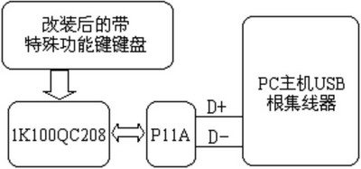 我们使用Altera公司1K100QC208芯片作为系统的核心芯片,实现键盘扫描,编码,USB接口以及整体系统控制的功能,配以Philips公司的P11A芯片,作为USB设备的和主机之间的 transceiver,外加一个改装后的带特殊功能键的键盘,组成USB带特殊功能键的键盘系统(图2)。