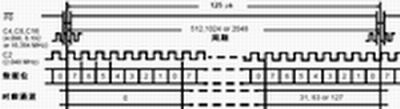 根据卓联对ST-BUS的信号及时序规范所作的定义,ST-BUS是一种传输数字信息的高速同步串行通信总线,总线接口所需信号有帧同步信号、位时钟信号和串行数据信号。帧同步信号主要有类型0和类型1两种:类型0的同步脉冲仅出现在帧的开头,如图1所示,总线上各部件将之作为重要参考信号并由此决定何时开始接收或发送数据流;类型1的同步脉冲需要维持一个完整的时隙周期(即8个位时钟周期),在此期间部件也要接收或发送信息数据,这种同步方式较少应用。ST-BUS定义了4种标准时钟频率,即16.384MHz、8.192MHz、4.096MHz和2.048MHz,其中每一种时钟频率均可作为部件的内部时钟,不过任意时刻只能选择其一,自适应系统在设计时采用了自动选择模式。除频率2.048MHz外,其它时钟频率总是数据速率的两倍,即支持最大数据速率为8.192Mbps。如果ST-BUS数据速率为2.048Mbps,那么时钟可以是2.048MHz或4.096MHz。由图1可知,一个完整ST-BUS的帧周期为125ms,而每帧又根据数据速率分为几种不同的时隙总数。但是,为了与E1信号的时隙相对应,E1终端子系统常采用每帧32时隙的信号方式。