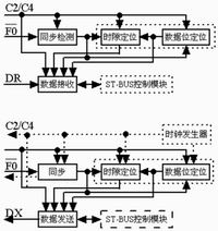 如图1所示,ST-BUS总线的数据收发遵守以下规则:发送端在时钟C2的上升沿发送,而接收端则在C2的下降沿采数据,且同步脉冲在0时隙开始的第一个C2上升沿处保持低电平。