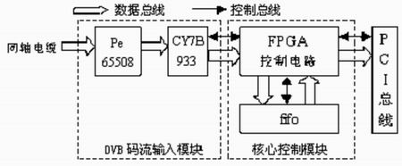 从图中可以看出,由于使用了FPGA及PCI IP核,使整个硬件电路显得特别简洁。它主要由DVB码流输入模块和核心控制模块组成。串行DVB传输流经同轴电缆进入DVB码流输入模块,转换为8位并行输出。核心控制模块对并行数据进行缓存,并采用DMA方式传输给PCI总线,完成本地总线和PCI总线的可靠通信。