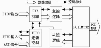本文在选择PCI接口芯片时,选择了Altera公司的PCI 编译器软件包,它可以参数化地生成用于PCI接口的IP核----MegaCore。这个可编译和综合的MegaCore有以下4种宏功能模块:PCI_MT64、PCI_MT32、PCI_T64和PCI_T32。它们都可以完成总线协议的转换,将复杂的、电气和时序要求高的PCI总线逻辑转换为易于操作的本地接口逻辑,遵循PCI总线协议2.2版,经过严格的工业级验证并支持多款优化FPGA。其中,PCI_MT32是支持33/66MHz工作频率、32位PCI总线、支持主/从模式的PCI IP功能模块。考虑到市场的需求,通常的PC主板都支持32位PCI,且在主模式下DMA控制器才能工作,因此选择了PCI_MT32。 本地信号都以l (local)开头,其中以lt_开头的是从控信号,以lm_开头的是主控信号。