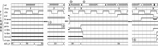 在Quartus-II中进行了vhdl源程序仿真。图4是用DMA方式进行PCI传输结果的仿真波形图。其中ASI_D为模拟输入的8位ASI码流,在对相应的DMA寄存器进行操作后,启动DMA引擎,图中①处PCI_MT32通过拉低reqn信号发出总线占用请求信号,②处PCI总线仲裁器通过拉低gntn信号允许PCI_MT32成为主设备。③处进入地址阶段,PCI_MT32在ad线上提供地址,在cben线上提供总线命令。在接下来的多个数据阶段(图中④处),PCI_MT32在ad线和cben线上分别提供ASI_D输入的数据和字节使能,由于输入ASI信号是8位,而ad线为32位,因此利用ad信号的低8位来传输数据,可见,输出数据与ASI_D输入的数据相同。由于DMA传输长度的关系,本图最后通过模拟从设备断开(图中⑤处),终止了这次传输。由于DMA传输没有结束,在终止后,DMA状态机根据判断状态,还会自动继续传输。从图中可以看出,framen、irdyn、trdyn、devseln等接口控制信号完全符合PCI时序的要求。实现了将ASI信号通过PCI总线与PC进行实时数据传输的目的。图中32位ad信号的高位没有得到充分利用,如果需要,可以很方便地利用它们将电路升级为两路或4路的多路DVB-ASI码流接收卡。如果使用支持64位PCI总线的PCI_MT64功能模块,则最多可以实现8路ASI信号的接收。