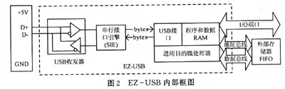 由USB芯片集成的加强型8051单片机来处理,当EZ-USB设备连接到USB口时,主机进行总线枚举,根据设备ID先使用系统程序将固件下载到芯片内部,然后进行重枚举,固件作为用户的功能设备开始执行。