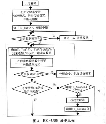 Cypress公司提供固件程序框架,来完成控制传输和大部分的数据传输工作。本采集系统的固件程序就是基于此固件框架开发的,使用KeilC进行编译。程序流程图如图3所示。