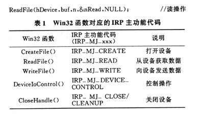 一旦应用程序获得设备的有效句柄,他就能够调用Win32函数,这将产生对应于此设备对象的相应IRP,发送给驱动程序,完成相应功能。这种关系如表1所示。