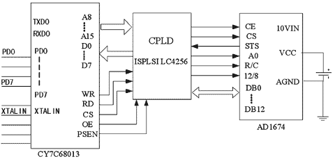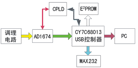 CY7C68013和AD1674之间通过CPLD连接,实现相关控制线和数据线的译码。在CY7C68013的控制下,首先对AD1674进行间隔采样,然后把结果传送到FIFO中,当采集到一定量的数据后,CY7C68013将数据打包通过USB总线传到PC,由高级应用程序进行数据处理。扩展的RS232接口可以和外部设备进行通信。上电时,CY7C68013从外部的E2PROM中通过I2C总线自动装载到内部的RAM中,便于固件的修改和升级。