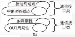 通常一个CDC类又由两个接口子类组成通信接口类(Communication Interface Class)和数据接口类(Data Interface Class)。笔者主要通过通信接口类对设备进行管理和控制,而通过数据接口类传送数据。这两个接口子类占有不同数量和类型的终端点(Endpoints),如图2所示。对于前面所述的不同CDC类模型,其所对应的接口的终端点需求也是不同的。如所需要讨论的抽象控制模型对终端点的需求,通信接口类需要一个控制终端点(Control Endpoint)和一个可选的中断(Interrupt)型终端点,数据接口子类需要一个方向为输入(IN)的周期性(Isochronous)型终端点和一个方向为输出(OUT)的周期性型终端点。其中控制终端点主要用于USB设备的枚举和虚拟串口的波特率和数据类型(数据位数、停止位和起始位)设置的通信。输出方向的非同步终端点用于主机(Host)向从设备(Slave)发送数据,相当于传统物理串口中的TXD线(如果从单片机的角度看),输入方向的非同步终端点用于从设备向主机发送数据,相当于传统物理串口中的RXD线。