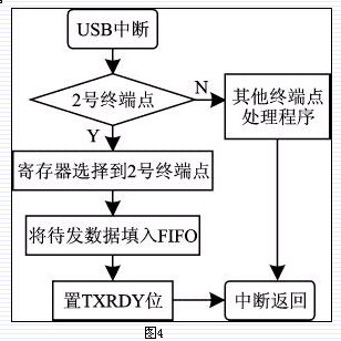 由于各个终端点的行为相对独立,对于每个终端点的控制过程又有相似性,在这里以2号终端点即作为数据接口的IN终端点为例,说明软件是如何对终端点进行操作和控制的,其控制流程图如图4所示。2号终端点是一个IN的终端点,它的主要工作是模拟物理串口的TXD线,向主设备发送数据。当主设备发出IN的请求时,如果FIFO不空,就向主设备发送FIFO的内容;如果FIFO为空,则向主设备发送一个空包作为回应。AT89C5131在收到IN的请求时,会触发USB中断(如果被使能),在中断处理程序中,如图4所示,首先判断中断的触发源是哪个终端点,如果是2号终端点,将USB寄存器组映射到2号终端点的那一组,然后将需要发送的串口数据填入FIFO寄存器(UEPDATX),置位UEPSTAX的TXRDY位,表示FIFO中的数据已经准备好,这时USB接口就会自动响应IN请求,并将FIFO中的数据发送出去,程序则可退出中断服务程序。对于其他的终端点,其处理过程也是相似的。