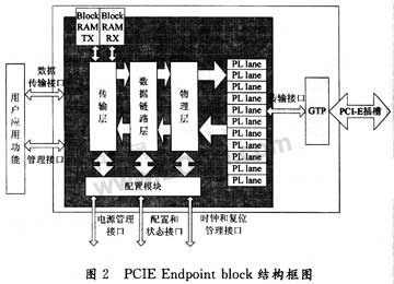 Virtex 5 Lxt PCIE Endpoint block集成了PCIE协议中的物理层(PHY)、数据链接层(DLL)和传输层(TL),同时它还实现了PCI-Express设备的功能配置寄存器,其结构框图如图2所示,包含有以下几个接口:时钟和复位接口、配置和状态接口、电源管理接口、用户接口和传输层接口。