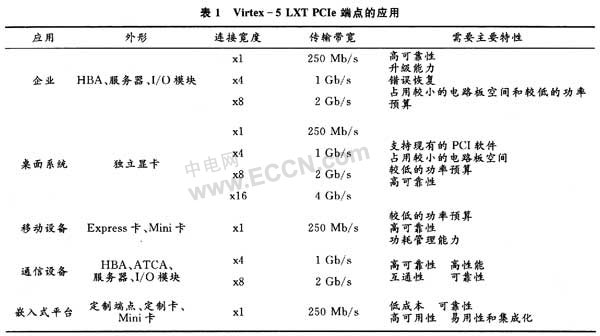 Virtex 5 Lxt PCIE Endpoint block具有PCI-Express的完整功能,完全符合PCIe基本规格v1.1版要求,作为FPGA内部的硬核,它是可配置的PCIe端点解决方案,大大增加设计的灵活性,降低设计的RNE费用,并且支持1x,2x,4x或8x通道的实现,为系统的功能扩张提供了有效途径;带有内置PCIe端点模块的Virtex-5 LXT FPGA芯片,能够被用于任何一种外形的产品设计,如表1所示。