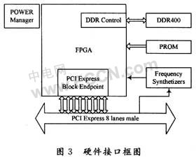 DDR是比较常用的高速缓存单元,这里选择使用现代公司的HY5DU56822DT-D4,在PCI-Express传输过程中,对时钟的稳定性要求很高;Virtex5 FPGA内部的CMT模块的时钟综合处理能力可能达不到预想的效果,这里使用专门的时钟管理单元提供时钟,选择的是ICS874003芯片,通过FPGA管脚控制其时钟综合的效果。