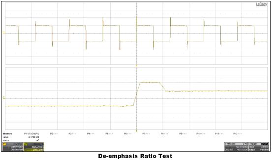 为了把5Gbps速率的数据传送较远的距离,USB3.0的发送端使用了去加重技术,这项测试可以测量DUT的去加重程度是否满足规范要求(要求在-3dB到-4dB之间)。测试时DUT发送出CP7码流,CP7码型由50-250个连续的1和50-250个连续的0重复交替组成,而且是添加了去加重的信号波形。图3为某USB3.0芯片的去加重测量结果,该芯片采用了-3.47dB的去加重。