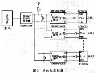 单片机构成,采用主从式结构,以AT89C52芯片为核心的从机既可以独立地完成数据处理和控制任务,又可以将数据传给上位PC机。PC机将这些数据进行处理、显示、打印,同时将各种控制命令传给各个从机,以实现集中管理和最优控制。它们之间的通信由SN65HVD3082E芯片完成。组成框图如图3所示。在接口之间接有匹配