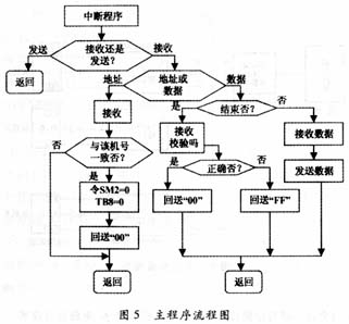 编程位(TB8)。工作方式:定时器T1设置为方式2,串口设置为工作方式3。单片机通过中断方式发送和接收数据。由于RS-485是一种半双工通信方式,发送与接收共用同一物理信道。各任何时刻只允许一台单机处于发送状态。因此,要求应答的单机必须在侦听到总线上呼叫信号已经发送完毕,且没有其他单机发出应答信号的情况下才能应答。主从机的时序有严格的要求,若配合不好会发生总线冲突,使系统的通信瘫痪,无法正常。应采取的措施:(1)复位时,主从机均应处于接收状态。在软件设计时,应使系统上电或正式通信前对串口做几次空操作,清除