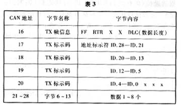 信息头和信息内容两部分。前5个字节为信息头部分(如下表地址16~20),其前29位(ID0~ID28)为标示符(4个字节),包含本信息包的目的地址。第5个字节是帧信息,FF为帧格式(0为标准帧,1为扩展帧格式),RTR为远程帧发送请求(0表示发送数据帧,1表示发送远程帧),X表示无关位,最后4位DLC是数据长度,即所发数据的实际字节数。其余8个字节是数据内容部分,即为实际所发的数据。表3说明了CAN报文数据格式(扩展帧)。