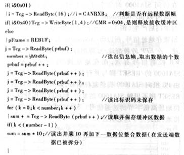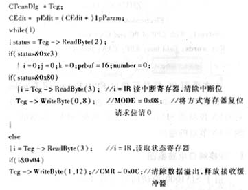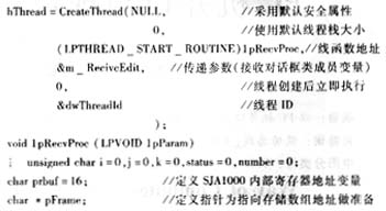 网络中一定要有接收方存在,否则SJA1000将由于无应答而一直处于发送状态。接收数据则采用查寻方法(VC++采用工作线程方法很容易实现)。以下为创建线程及线程执行函数(在执行函数体中以接收数据并输出为例,不考虑CAN总线远程帧请求,SJA1000的基地址为0)。