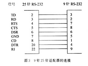 在连接的两端都有相同类型的连接器的时候,要连接DTE和DCE,电缆可直接连接对应的每一根导线,引脚1到引脚1,引脚2到引脚2等等。如果连接一个9针和一个25针的连接器,需要一个准确收发信号的电缆或者适配器。可在一个引出口盒的两头使用一个9到25针(或相反)的适配器。如图3所示。