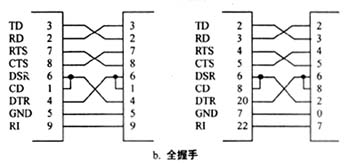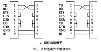 全握手连接允许硬件握手。数据和握手信号输出连接到它们在另一台设备上的相应的输入 。在一个循环回送连接中,握手信号输出循环回送给自身设备的相应输入,图4(b)所示。这在一台设备要求有握手信号而另一台不提供握手信号的时候就很有用处。但是,使用这种类型的连接如果接收设备不能跟上发送速度就会导致数据错误。