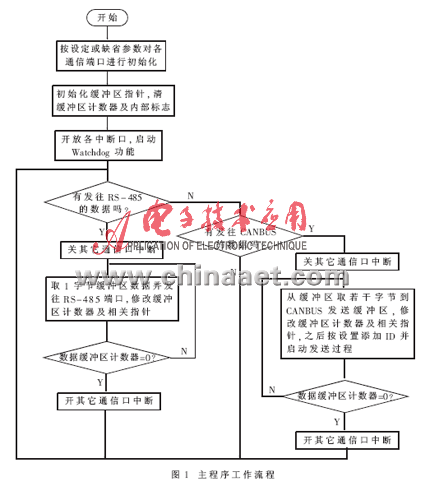 在未进入转换工作时,电路允许参数设置端口的设置中断进入。参数设置包括:设置RS-485的通信波特率(当然端口数据格式也可设);设置CANBUS的通信波特率、接收码(accept-code)、屏蔽字(mask-code)、发送标示符。参数设置好后将立即生效,通过该端口还可查询当前电路中的各运行参数值。电路工作的主要流程图如图1所示。