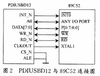 Philips公司的PDIUSBD12芯片符合USB1.1规范,采用28脚SO或TSSOP封装,可以在3.3±0.3 V或3.6~5.5 V两种电压下工作,内部集成SIE、320 B的FIFO缓存、收发器以及电压调整电路和终结电阻器,提供2 MB/s速率的并行接口,具有全自治本地DM A功能,芯片提供的多重中断模式有利于批量和等时数据传输模式。芯片还提供了可编程时钟、上电复位和低电压复位电路。芯片提供了双倍的输入输出缓冲,在批量模式达到1MB/s数据传输率,同步模式也可达到1 MB/s数据传输率。