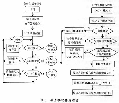后台D12中断服务程序和模块式无线数传收发模块中断服务程序与前台主循环程序之间的数据交换,通过事件标志和数据缓冲区来实现。后台中断服务程序由中断触发,通过标志位与主模块通信。主模块循环扫描各标志位,对相应的标志位做出处理。例如,模块式无线数传收发模块接收到有效数据后,送入串口触发串口中断,进入模块式无线数传收发模块中断服务程序,将数据接收后放入数据缓冲区,然后设置UART_DATA标志,退出子模块。主模块查询到UART_DATA被置位,则调用?writendpoint()程序将数据发往PC。