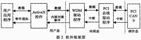 由于PCI设备的中断、I/O端口、映射内存等资源都是动态分配的,必须编写驱动程序管理硬件,才能供用户编程使用。为了通用性和兼容性,CAN卡驱动程序的开发采用支持Windows XP、Windows2000和Windows98的WDM驱动程序。开发工具采用Visual C++6.0和Win2000 DDK。由于CAN卡上没有微控制器,因此对CAN总线端口的所有操作都是由驱动程序来完成的。这不仅可以由计算机来实现复杂的功能,例如,错误检测、断点续传等,同时节省了硬件,而且有利于CAN卡的升级——只要更换驱动程序即可。驱动程序的功能主要是配置SJA1000的CAN接口、收发CAN总线上的数据、对CAN总线进行实时监测、接收用户程序的收发命令。收发数据和CAN总线错误均采用中断处理,驱动程序可以快速响应,通过事件(Event)内核对象直接通知给用户程序。由于WDM驱动程序运行在系统的内核态,编写非常复杂,限于篇幅,仅给出软件的框图(见图2)。