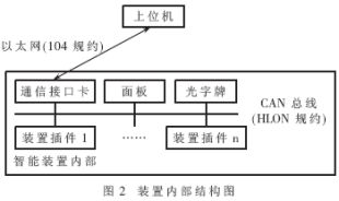 智能装置内部各功能模块采用高速现场总线CAN网络相连,总线不出装置,功能模块之间的数据交互快速可靠。在组帧上采用HLON规约,并使用CAN 2.0B扩展模式,为了保持协议标准化,在HLON规约的基础上封装了IEC101规约。其内部结构如图2所示。