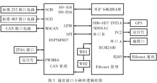 通信接口卡使用双处理器结构。一部分是使用Motorola公司DSP56F807芯片作为接口卡的CAN通信管理模块;另一部分是使用Rabbit2000核的RCM2100集成卡作嵌入式网关和CAN到ETHERNET规约转换模块。通信接口卡硬件逻辑框图如图3所示。