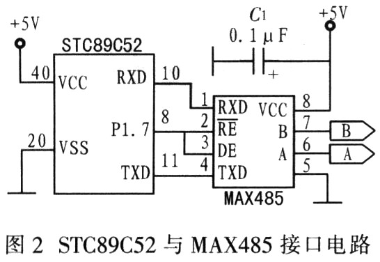 由于80C51系列单片机STC89C52串行接口的,TTL电气特性与RS-485电气特性不相符,STC89C52不能与RS-485直接连接,需要电气转换。这里采用Maxim公司的MAX485,图2为其接口电路。