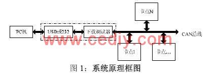 2.1 系统原理框图。如图1所示,PC机通过高速的USB方式或低速的UART方式连接到下载调试器上,下载调试器将PC的消息封装成CAN命令帧的形式转发,完成下载功能或CAN节点调试功能。