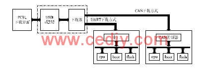 2.3下载器原理框图。如图2所示,当使用下载器功能时,用户可以选择CAN下载方式或串口下载方式,但为了保证下载的正确性,每次只允许连接一个从设备。