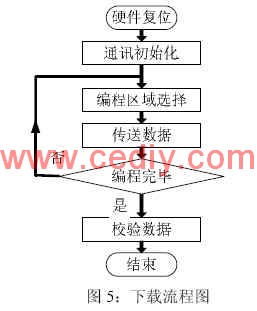 从机中固化的驱动程序遵守CAN2.0A标准帧协议格式,数据帧的11位标识符用来对目标器件和目标器件的寄存器寻址。因此将标识符的高8位作为基地址,用来区分不同的器件;将标识符的低3位作为偏移地址,用来代表不同的命令。编程器首先发送偏移地址为0的数据帧,进行通讯初始;接着编程器发送偏移地址为1的数据帧,选择编程区域(Flash或EEPROM),并设置编程的起始和结束位置;从机发回应答消息后,编程器通过偏移地址为2的数据帧连续发送编程数据;一个数据块发送完毕后,编程器继续选择需要编程的区域,直到完成整个写数据任务;此后编程器发送偏移地址为3的数据帧读取从机Flash或EEPROM中的数据,完成数据校验的任务。编程器也可以发送偏移地址为4或5的数据帧对一些配置字节进行修改。下载的流程图如图5: