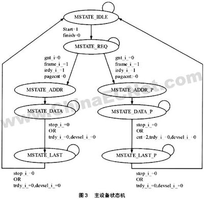 时序状态机是pci接口控制器的核心,各种令名、数据交换、控制均在状态机的管理下进行工作。图3是实验板做主设备时,pci总线接口控制器时序状态机。实验板做目标设备的状态机就不在这里介绍了。