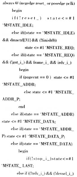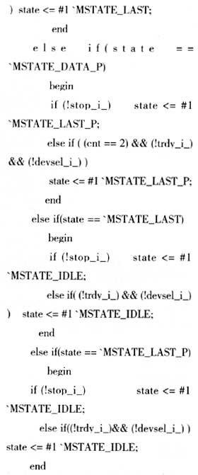 mstate_addr_p:主设备数据地址状态。这个状态同mstate_addr状态一样的是,开始地址周期。所不同的是ad上出现的是在mstate_data状态下读到的32位数据地址信息。根据需要,可以进行读/写存储器操作。
