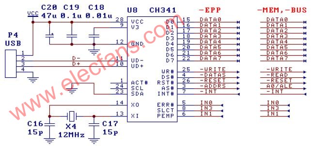 地线是黑色,D+信号线是绿色,D-信号线是白色。USB 总线提供的电源电流最大可以达到500mA,一般情况下,CH341 芯片和低功耗的USB 产品可以直接使用USB 总线提供的5V 电源。如果USB 产品通过其它供电方式提供常备电源,那么CH341 也应该使用该常备电源,如果需要同时使用USB总线的电源,那么可以通过阻值约为1Ω的电阻连接USB总线的5V 电源线与USB 产品的5V常备电源,并且两者的接地线直接相连接。电容C18 用于CH341内部电源节点退耦,C18是容量为0.01μF 的独石或高频瓷片电容,如果对EMI 没有要求那么可以省掉C18。电容C19 和C20用于外部电源退耦,C19是容量为0.1μF 的独石或高频瓷片电容。晶体X4、电容C16和C17用于时钟振荡电路。X4 的频率是12MHz,C16和C17是容量为15pF 的独石或高频瓷片电容。