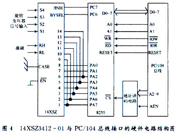 14XSZ3412-01与PC/104总线接口的硬件电路结构如图4所示,图中,A/D转换器的S1,S2,S3,S4端分别与旋转变压器的输出信号引脚D1,D2,D3,D4一一对应连接,RH,RL分别接旋转变压器的激磁引线端Z1,Z2,CASE接机壳地。CPU通过8255来控制XSZ模块的工作,包括启动读数的控制信号,高低字节选择信号等,其工作原理为当需进行数据传输时由CPU通过8255向XSZ模块的INH端发送低电平,以禁止XSZ模块锁存器的数据刷新,当INH被置于低电平并延迟600ns后,CPU便可读取数据,读取数据时通过控制BYSEL端的高低电平即可读取高低字节数据,EN与地相连,则计算机可以随时读取数据。