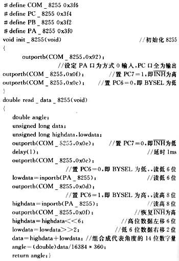 以某寻北仪系统测量方位角为例,给出数据采集部分的程序如下(系统中8255命令字口地址为0x3f6):