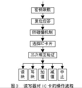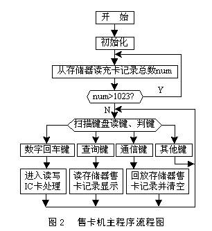 主程序主要完成系统变量的初始化,循环扫描键盘,检测操作IC卡,将操作结果存储和显示。在售卡机中使用了8KB的24C64作存储器,主要存储的内容有:售卡机机号(1字节)、售卡总金额(3字节)和总记录(2字节)。售出的每张卡的记录包含:用户卡身份号(4字节)、售卡日期(2字节)、加卡金额(1字节)和售卡人编号(1字节)。因此最大能存储1023张售卡记录。主程序流程如图2所示,读写器对IC卡的操作流程如图3所示。
