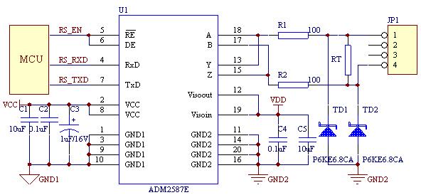 ADM2582E/ADM2587E与其它RS-485接口芯片相比,集成了磁隔离技术和DC/DC电源,是一个真正意义上的单芯片RS-485集成芯片,大大的减少了PCB板面积。ADM2582E/ADM2587E应用电路如图5所示,本电路仅供参考,若遇特殊应用,为了设备及系统安全,可以选择相应的其它保护措施,如TVS 等等。