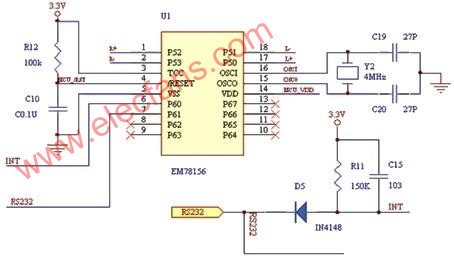图中L、L+控制左边路马达PWM,R、R+控制右路马达PWM。RS232接收传感器坐标数据输入。IC工作于3.3V电压,上电后自动复位。系统时钟采用4MHz外接晶振。
