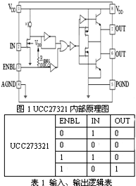UCC27321的ENBL是给设计者预留的引脚端,为高电平有效(见表1)。在标准工业应用中,ENBL端经100K的上拉电阻接至高电平。一般正常工作时可以悬空。为求可靠,也可将其接至输入电源高电平,低电平时芯片不工作。通过对ENBL的精心设置可以设计出可靠的保护电路。