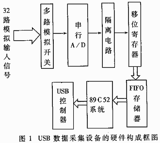 USB数据采集设备的硬件构成见图1.从图1可知,32路模拟输入信号由多路模拟开关控制将其中的某一路信号接入串行A/D(选用B-B公司的ADS7809),A/D转换的结构经光电隔离后串行输出到移位寄存器,移位寄存器将此结果转为并行数据并写入FIFO存储器,80C52系统将数据从FIFO存储器中读出并通过USB控制器送到主机。