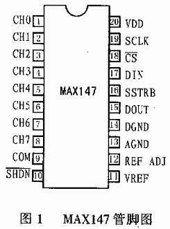 MAX146/147的管脚排列如图1所示,它具有20脚DIP/SSOP两种封装形式。其中MAX147的20个管脚功能如下: