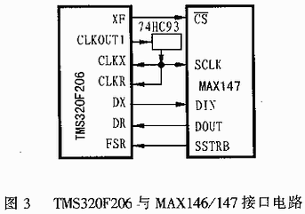 (4)MAX147的SSTRB引脚的输出用于给TMS320F206的FSR引脚提供输入信号,SSTRB的下降沿表示转换正在进行,该下降沿同时可作为TMS320F206的帧同步信号来通知TMS320F206准备接收数据。