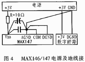 电源线上的高频干扰也会影响A/D转换的正确转换工作,为此,图4中在MAX146/147的电源输入脚VDD与上述的模拟地输入起点间并联了两个电容,其值分别为1μF和0.1μF,同时应使电容的两个管脚尽量短,以减小从电源上引入干扰。在电源上干扰幅值很大时,可按图中所示在VDD和电源间再接一个10Ω的电阻,组成一个低通滤波器。