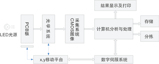 AOI,也称为自动视觉检测,是基于光学原理,综合采用图像分析、计算机和自动控制等多种技术,对生产中遇到的缺陷进行检测和处理,是较新的确认制造缺陷的方法。AOI系统按技术划分为精密机械、电气控制、视觉系统、软件系统4大部分组成,其核心是一套基于CMOS或CCD的图像采集系统、交流伺服控制x、y工作台及图像处理软件系统。图1为所设计的PCB板AOI检测系统框图。