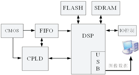 针对AOI系统要求,选用基于DSP+CPLD的图像采集处理模式。图2为视觉采集系统框图。系统通过DSP给CPLD发出一个采集命令,由CPLD控制CMOS图像传感器向FIFO的写入图像数据,同时DSP通过DMA将图像转移至SDRAM中并进行图像处理,在处理结束后,将处理的结果通过DSP内置的USB接口传给微机或其他设备。 I/O接口经扩展后,将控制触发信号交由工作台及电气控制系统,完成系统采集控制的目的。