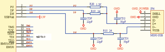 图3为DSP片内USB模块与PC机进行数据通信的硬件接口电路。其中左边3个引脚PU、DP、DN是TMS320VC5509A的片上引脚,右边的6个引脚组成了一个Mini USB接口,利用USB连接线就可以完成与PC机的连接。中间的阻容电路起加强输入输出可靠性的作用。